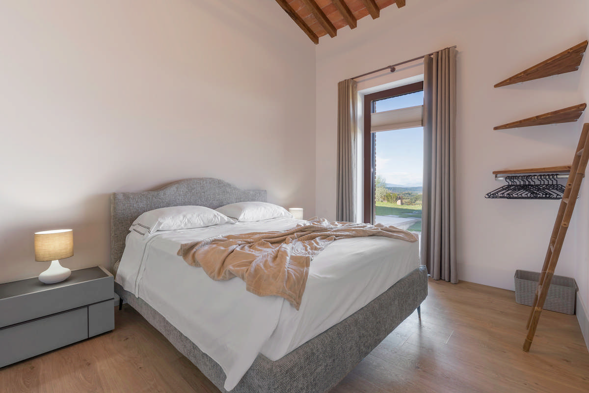 This beautifully and tastefully furnished apartment, featuring large windows, immediately stands out as you enter the Spereto domain. It may well be the appartment with the most ideal location on the estate, offering breathtaking views over the Tuscan hills. Early in the morning or at sunset, if you’re lucky, you may even spot deer grazing in the meadow below.